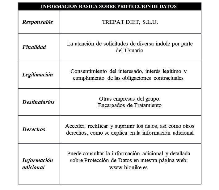 El Usuario podrá plantear las cuestiones que considere en relación a la presente Política así como ejercer sus derechos en los términos legalmente previstos debiendo para ello dirigir una comunicación mediante correo postal a: TREPAT DIET, S.L.U.., C/ dels Remences, 15 (Polígono Industrial Vallveric) 08304Mataró (Barcelona), o correo electrónico a: info@bionike.es